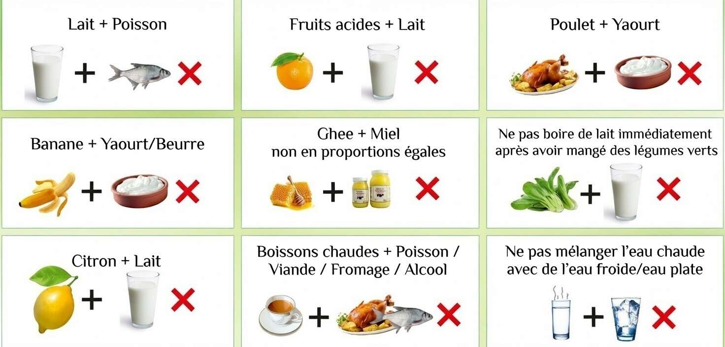 En Ayurveda, chaque aliment a des propriétés : chaud ou froid, lourd ou léger, sec ou humide... Quand deux aliments aux propriétés opposées sont mélangés, ils créent un conflit dans l'estomac. Par exemple, un aliment froid peut "éteindre" le feu digestif (Agni), causant fermentation, gaz et indigestion.